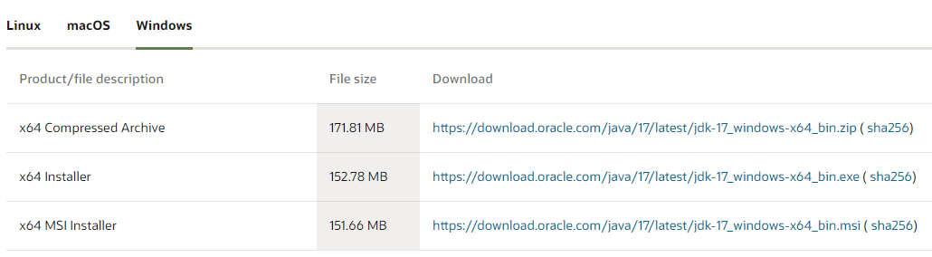 다운로드 링크: https://www.oracle.com/java/technologies/downloads/#jdk17-windows