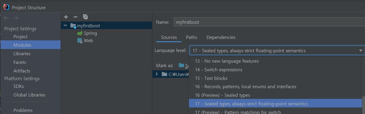 SDK 버전은 17이고 Language level도 17로 되어있다.