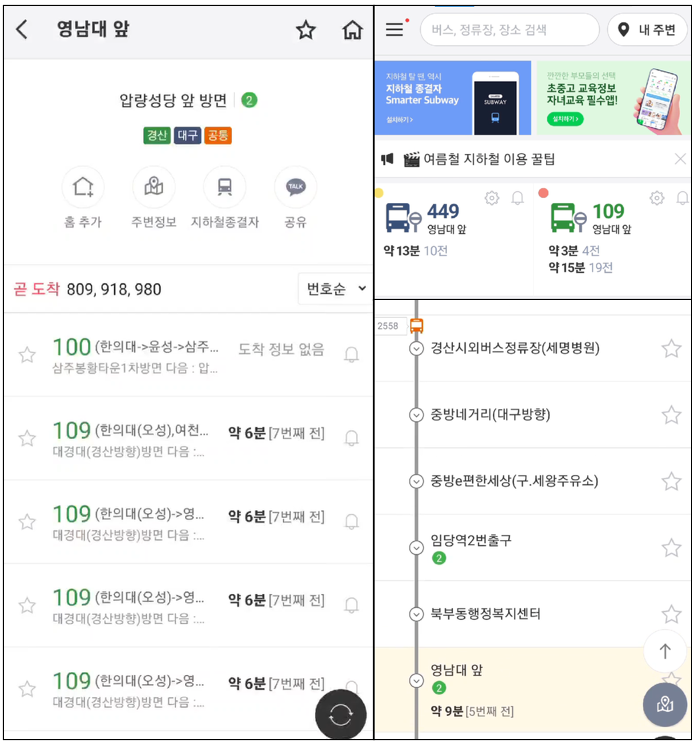 버스 도착 정보를 알기 위해 카카오지도앱, 네이버지도앱 등을 자주 이용하시는데요. 지도앱에서 버스정보가 조회되지 않는 경우가 꽤 있습니다. 특히 서울이 아닌 지방의 경우 버스정보가 잘 조회되지 않는 것 같습니다. 저는 구미에 거주 중인데, 버스정보를 조회할 때는 카카오지도를 사용하지 않습니다.
