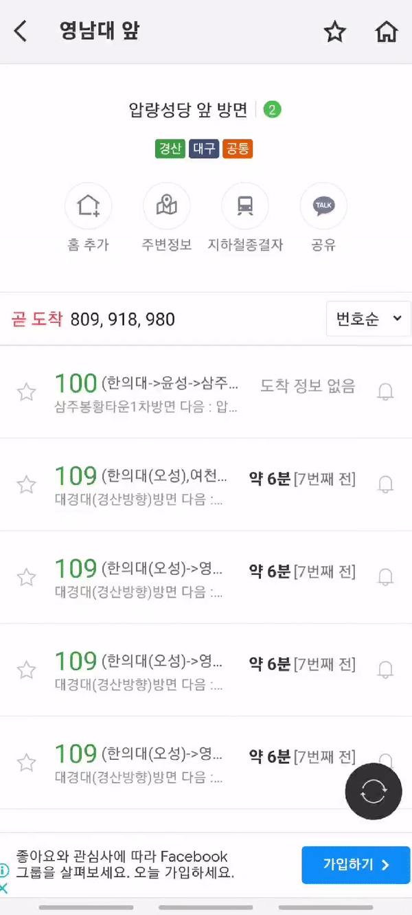 즐겨찾기에 추가하면 앱을 시작했을 때 메인화면에 바로 정류장정보가 등록됩니다.