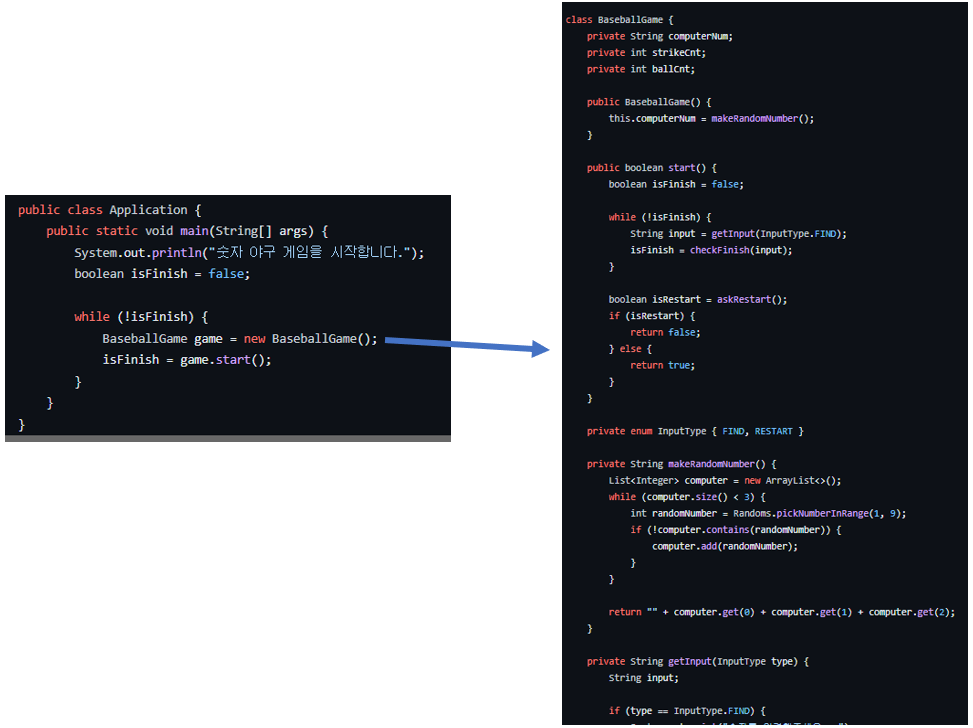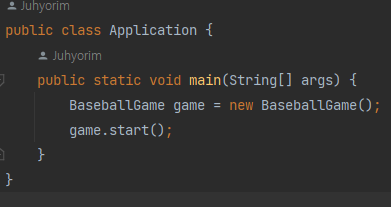 조금 더 객체지향적으로 만들어보고 싶다는 생각이 들었고, BaseballGame이라는 클래스를 만들어 객체지향적으로 만들고자 하였습니다.