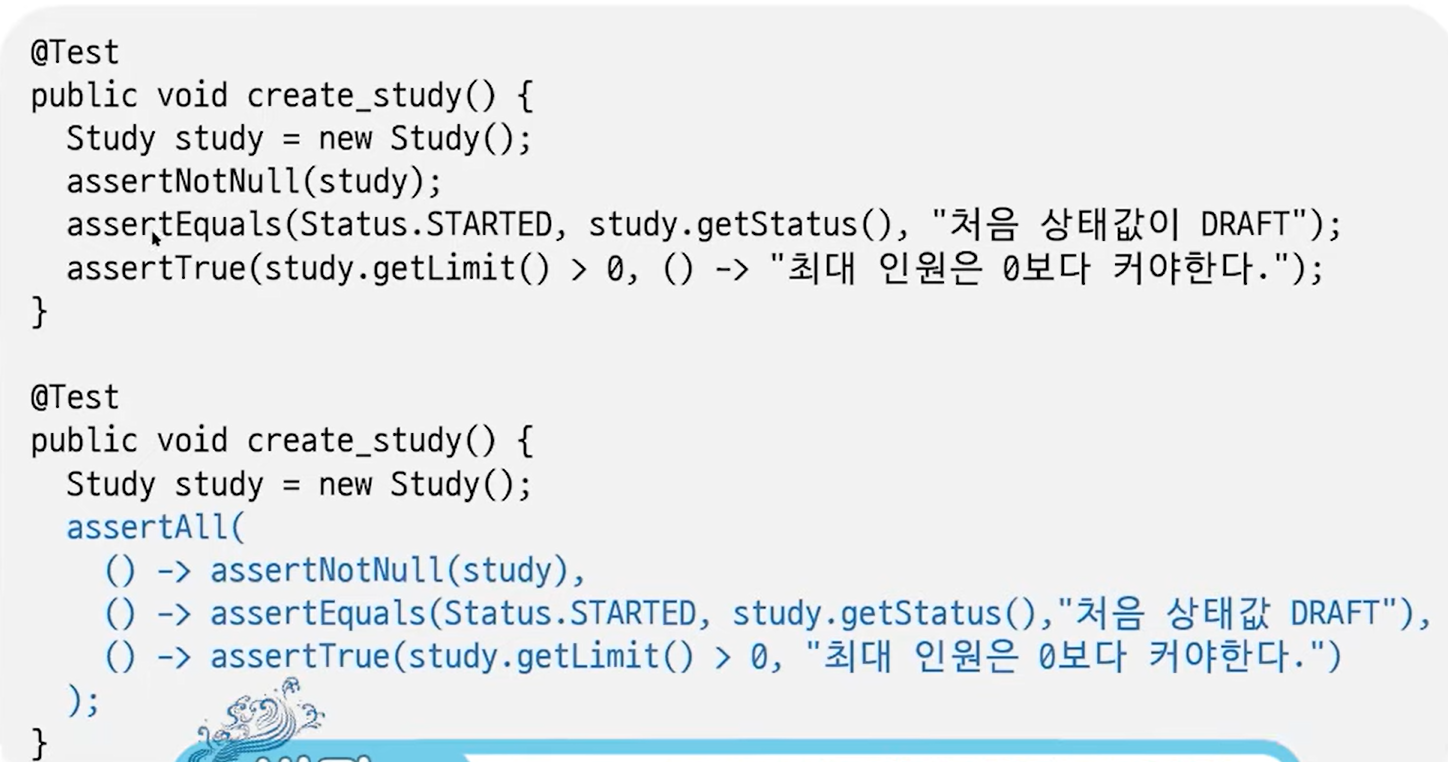 - JUnit5에서는 assertion문 전체를 실행할 수 있는 기능이 추가되었다