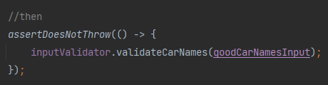 assertThatThrownBy(() -> inputValidator.validateCarNames(input))