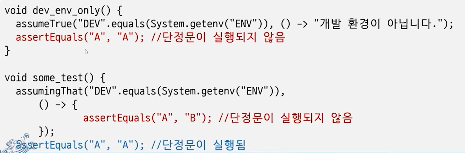 - assumeTrue: false일 때 이후 테스트 전체가 실행 x