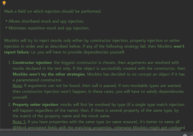 요약하면, @InjectMock을 수행하면 클래스에 있는 생성자를 찾아 주입이 가능한지 확인한다. 그리고 마땅한 생성자가 없다면 setter/필드 주입을 사용한다고 한다.