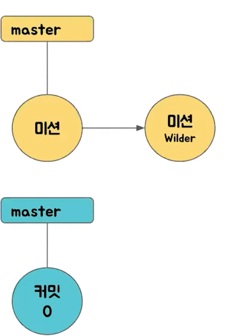fast-forward merge의 조건은 두 브랜치 커밋의 베이스가 같아야하는 것이다. 이번 상황에선 두 브랜치의 커밋 베이스가 다르다