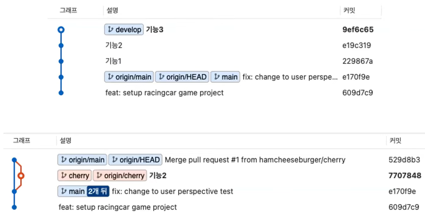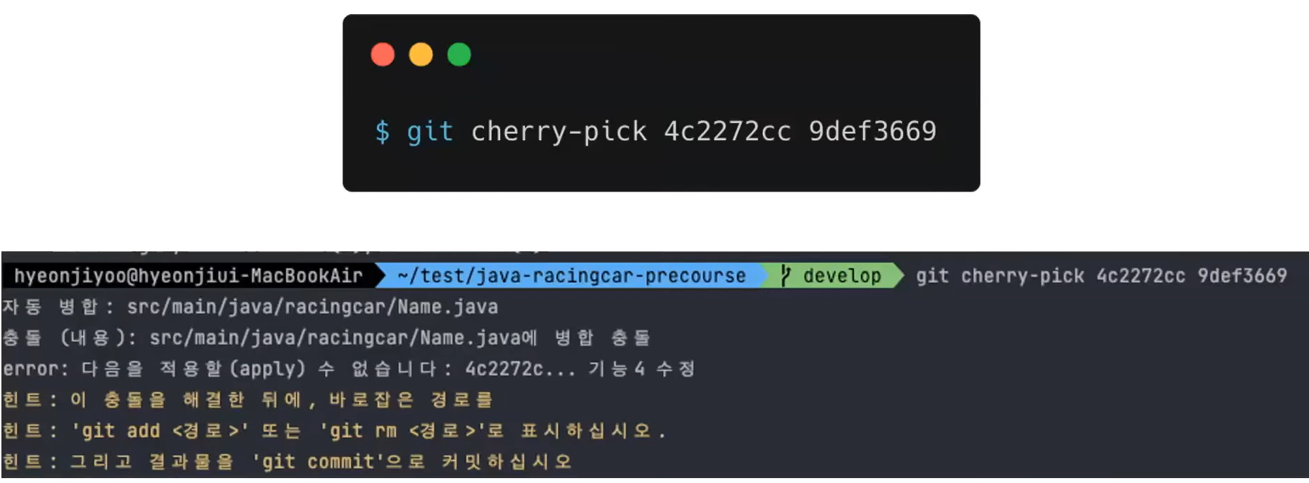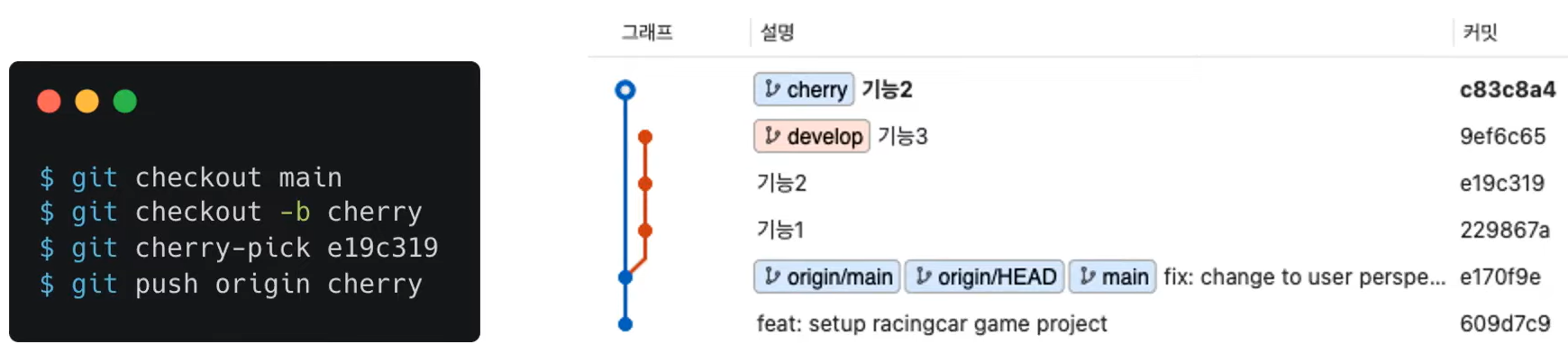 - 원하는 커밋만 쏙쏙 골라 다른 브랜치에 반영이 가능하다!