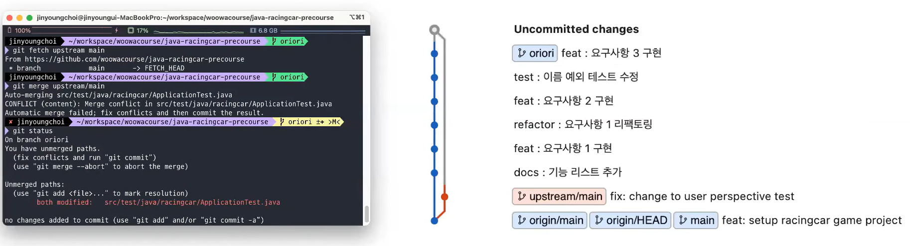 git status로 자세한 결과를 확인가능하다. unmerge된 이력~