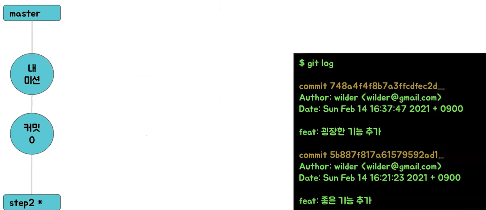 - git log로 커밋들 로그 확인가능하다 -> 작업중인 곳에서 해당 커밋 가져와서 등록가능
