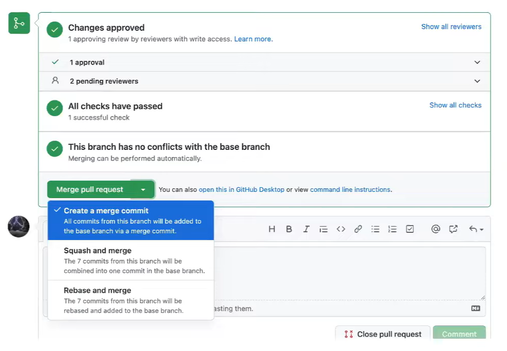 - 풀리퀘스트를 보면 다르게 동작하는 3가지의 merge방법을 제공한다.