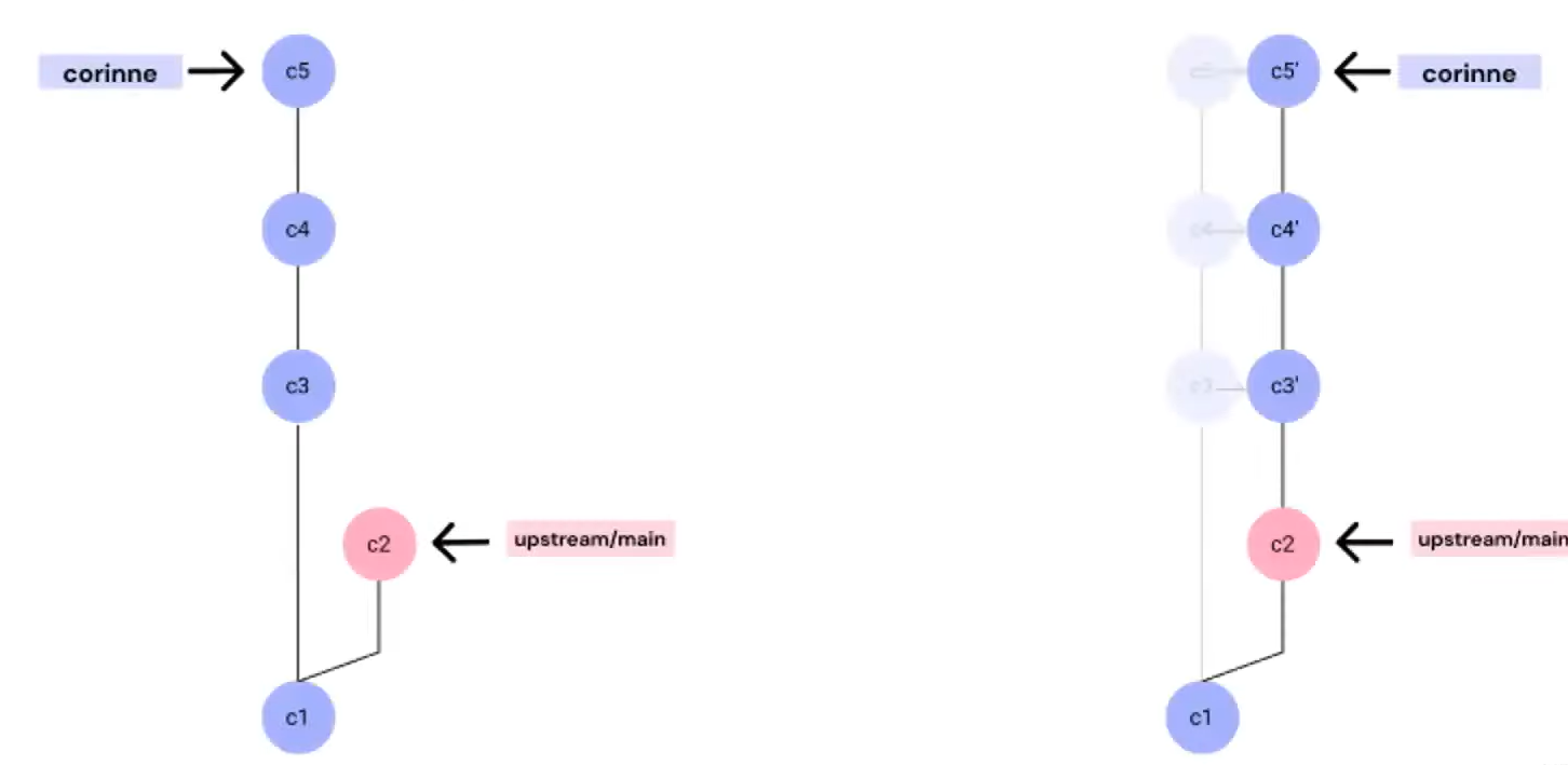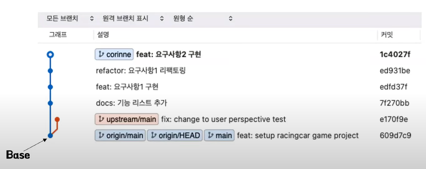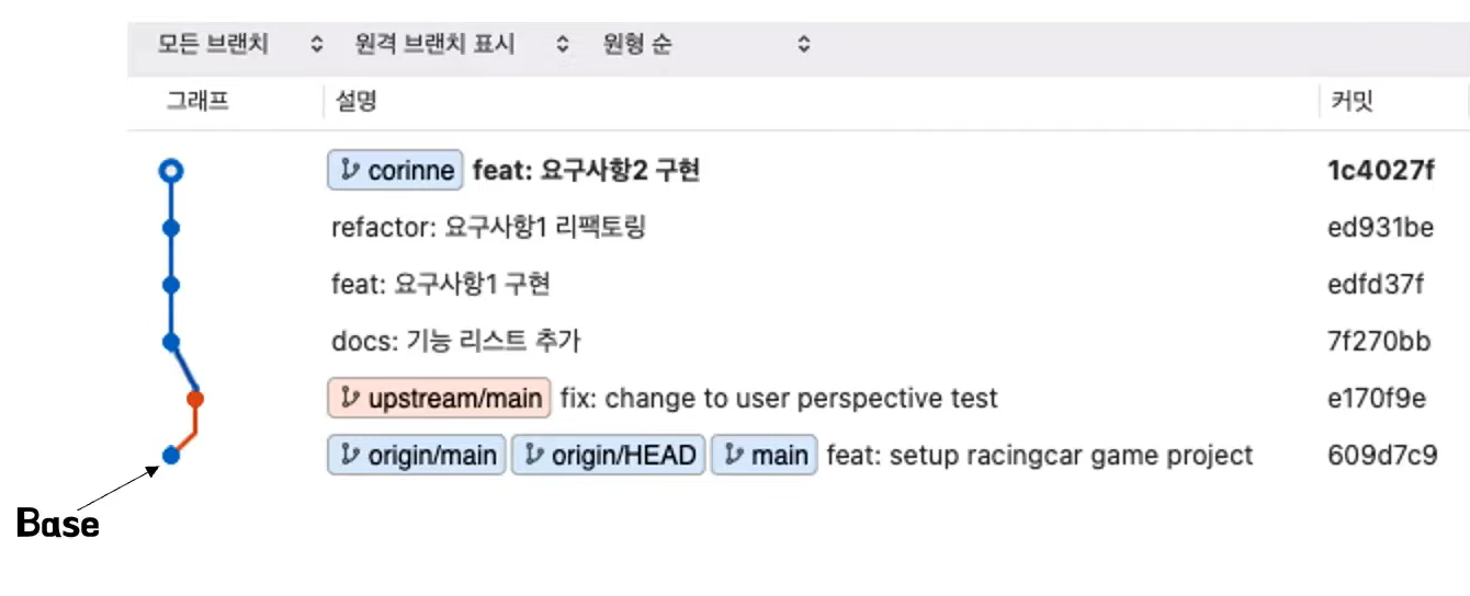 reabase upstream main을 실행하면 베이스가 upstream의 main이 가리키는 곳으로 변경된다