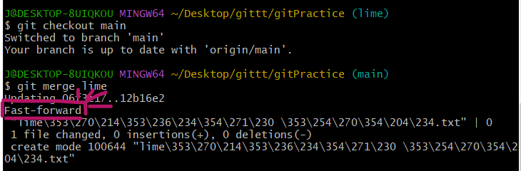 - 현재 브랜치가 가리키는 커밋(=main)을 머지할 브랜치(lime)가 가리키는 커밋으로 옮긴다고 생각하면 된다
