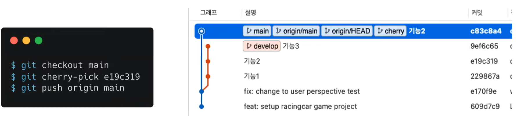 - 이 때 기능2만 origin main에 포함하는 방법이 cherry-pick이다.