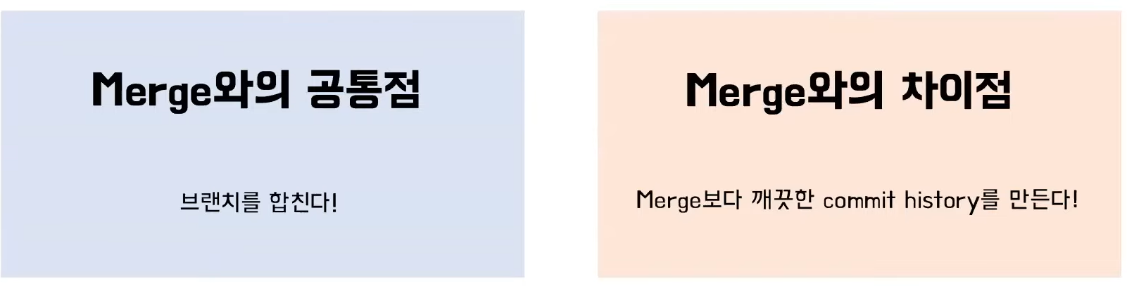 - rebase는 서로 다른 브랜치 합칠 때 사용한다는 점에서 merge와 비슷하다.