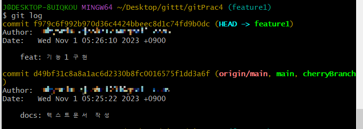 feature1에서 가져올 커밋의 아이디를 확인한다