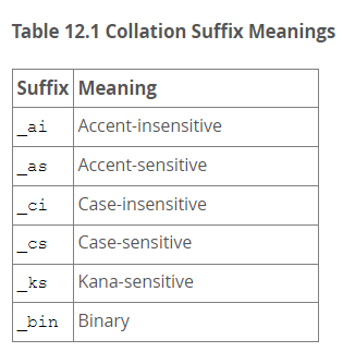 collation은 utf8_general_ci, utf8_0900_ai_ci 등 다양한 게 존재하는데, 붙을 수 있는 suffix의 의미에 대해 먼저 알아보겠다.