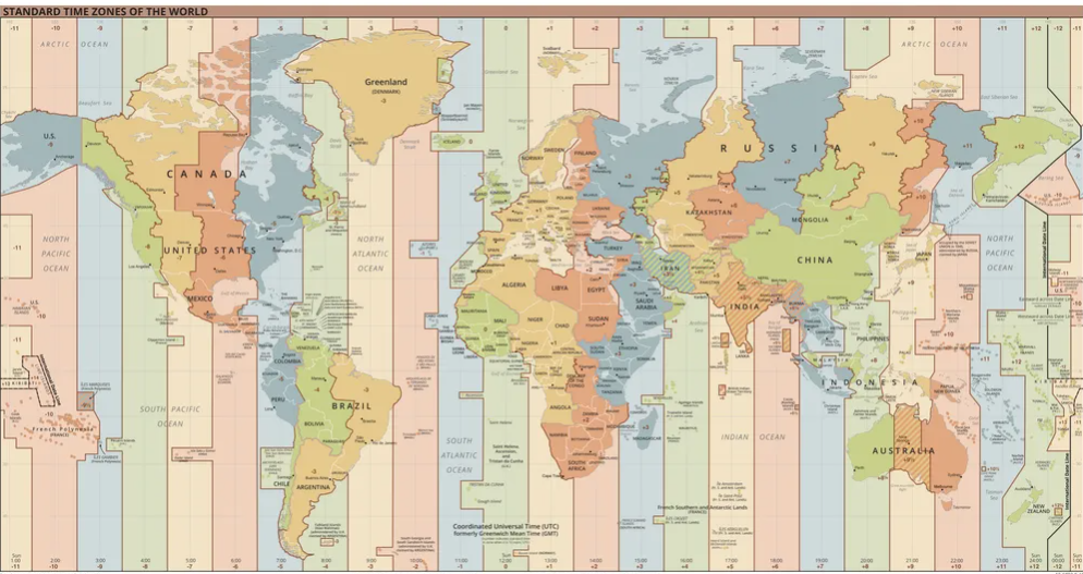 표준시는 여러 개로 나뉘는데, 영토가 넓은 국가들은 timezone이 여러 개인 경우도 있다.